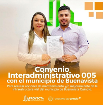 La alcaldía de Buenavista liderada por Jhon Steban Aristizábal Rendón, y la Empresa para el Desarrollo Territorial – PROYECTA a través de su gerente, Lina Marcela Roldán Prieto, suscribieron el convenio interadministrativo 005 por medio del cual buscan aunar esfuerzos para realizar acciones de mantenimiento y/o mejoramiento de la infraestructura vial en esa localidad cordillerana.