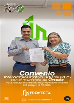 Honrando el compromiso del gobierno que orienta Juan Miguel Galvis Bedoya, de apoyar el desarrollo social y turístico de los municipios quindianos, la empresa PROYECTA a través de la gerente Lina Marcela Roldán Prieto, y el alcalde de Circasia, Julián Andrés Peña Sierra, suscribieron el convenio 008, para realizar mantenimiento y/o mejoramiento al parque El Mirador en la localidad.