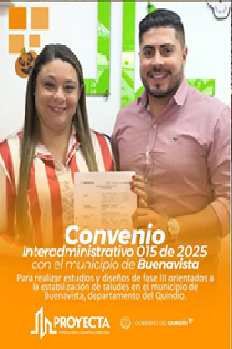 El día martes 21 de Octubre un trabajo articulado para proteger a la comunidad y promover la gestión preventiva del riesgo, la Gobernación del Quindío, a través de la Empresa para el Desarrollo Territorial – PROYECTA, y la Alcaldía de Buenavista firmaron el Convenio Interadministrativo N.º 015 de 2025, que permitirá adelantar los estudios y diseños de fase III orientados a la estabilización de taludes en zonas estratégicas del municipio.