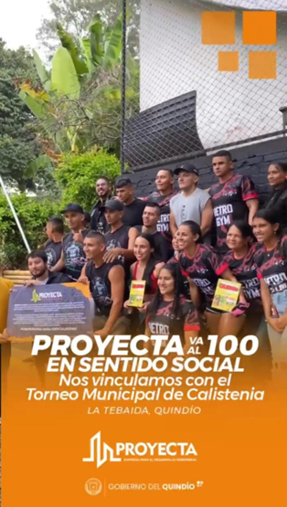 El pasado fin de semana se llevó a cabo en el polideportivo Pisamos de Tebaida, el Torneo Municipal de Calistenia en categorías principiantes, mujeres y élite. La gerencia de la Empresa Para El Desarrollo Territorial – PROYECTA, encabezada por Lina Marcela Roldán Prieto, entregó un bono de 500 mil pesos al grupo de jóvenes participantes en el evento, para la compra de implementos deportivos, apoyando así las iniciativas juveniles y fomentando el uso de estos espacios. Hasta allí llegaron trabajadores de la empresa que acompañaron y disfrutaron de la jornada