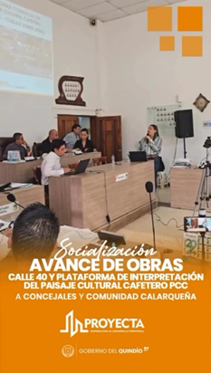 El viernes 23 de agosto la gerente de la Empresa para el Desarrollo Territorial PROYECTA, Lina Marcela Roldán Prieto, expuso ante los concejales y comunidad del municipio de Calarcá los avances de las obras de la calle 40 y la Plataforma de Interpretación del Paisaje Cultural Cafetero PCC, dejando un balance positivo sobre la ejecución de estas dos grande obras para el municipio de Calarcá.