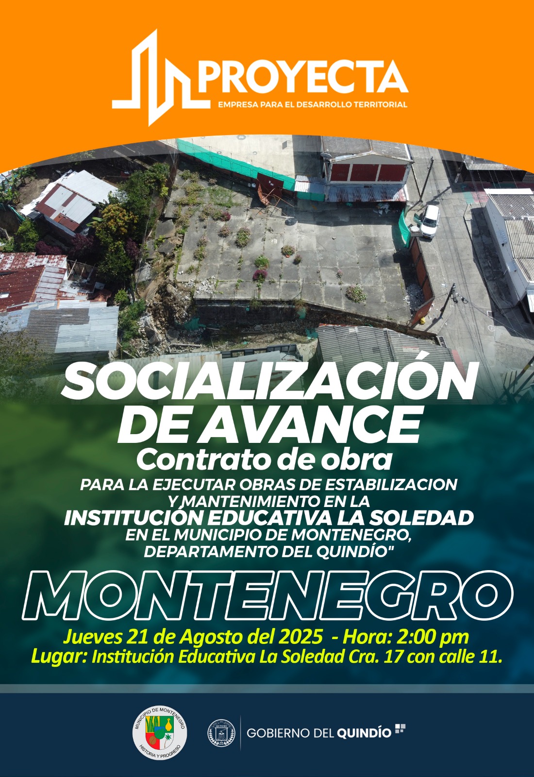 SOCIALIZACION DE AVANCE DE CONTRATO DE OBRA PARA LA ESTABILIZACION Y MANTENIMIENTO EN LA INSTITUCION EDUCATIVA LA SOLEDAD DEL MUNICIPIO DE MONTENEGRO QUINDIO