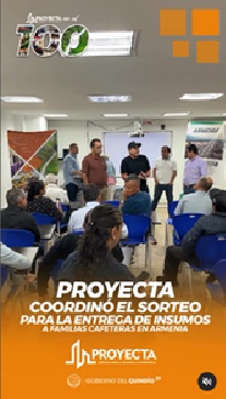 PROYECTA en compañía de la personería y funcionarios de la alcaldía de armenia, realizo sorteo que beneficio a las familias cafeteras del municipio de armenia, a través del proyecto de fortalecimiento del Paisaje Cultural Cafetero -PCC-, impulsado desde el gobierno liderado por Juan Miguel Galvis Bedoya y de la empresa PROYECTA, en esta oportunidad se vieron beneficiadas 28 familias cafeteras pertenecientes a distintas veredas de esta municipalidad, se resaltó que las familias que cumplan con todos los requisitos que se exigen en el marco de este proyecto, serán dotadas de insumos y elementos que facilitaran su actividad cafetera, lo que permitirá una mejora en los procedimientos de cultivo, dejando como resultado una mejor y mayor productividad de café.